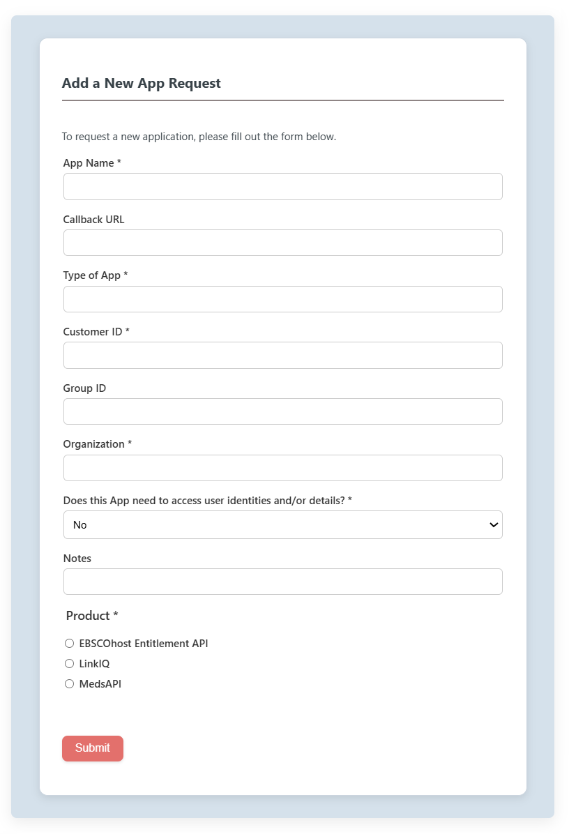 1. Enter the following information. This form is used by many EBSCO products. Therefore, there are some fields that are required that are not used by MedsAPI.